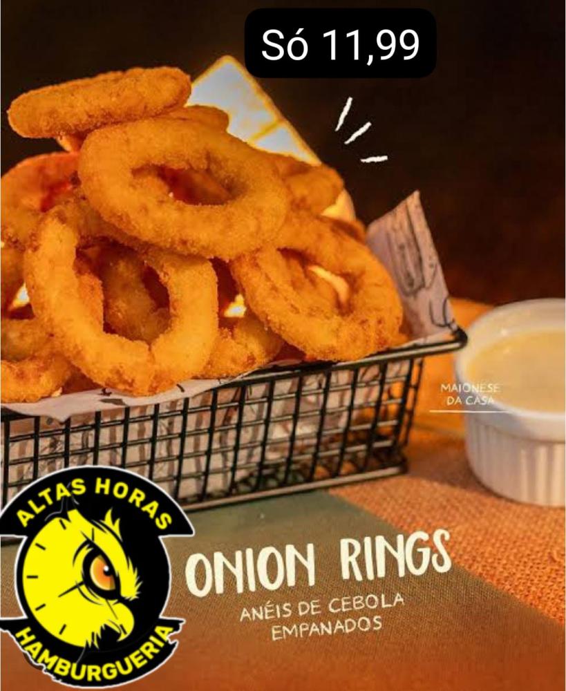 Porcao de aproximadamente 250g de onion rings , acompanha molho verde .