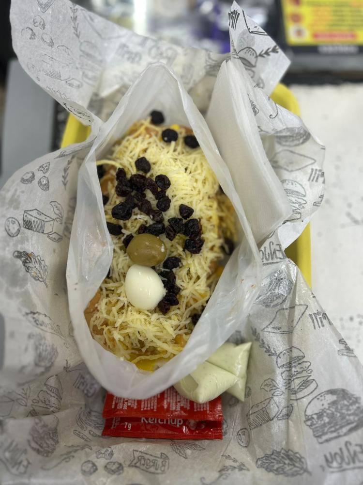 Pão,linguiça, molho,ketchup, maionese, mostarda, milho, ervilha, batata palha,passas,ovo de codorna, azeitona e queijo parmesão ralado .